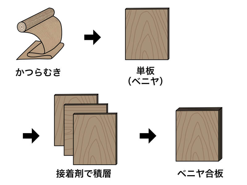 ◉ベニヤ板(単板)→1枚の板からなる木材