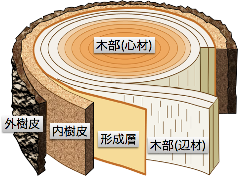 樹幹の形成層は細胞分裂を行い木を成長させる部分なので生きていますが、辺材(白太)は分裂後しばらくは生きているのですが、リグニンの沈積に伴って抜け殻(細胞壁)だけを残して死んでしまいます。