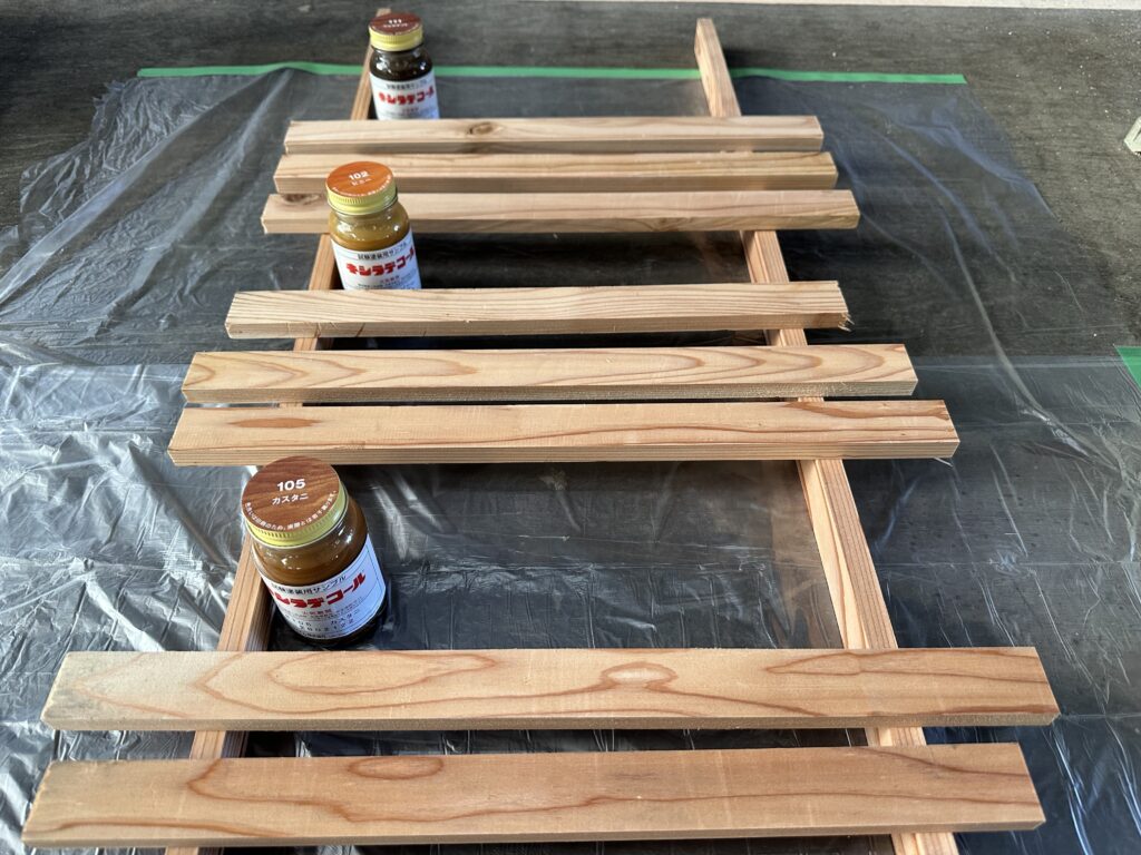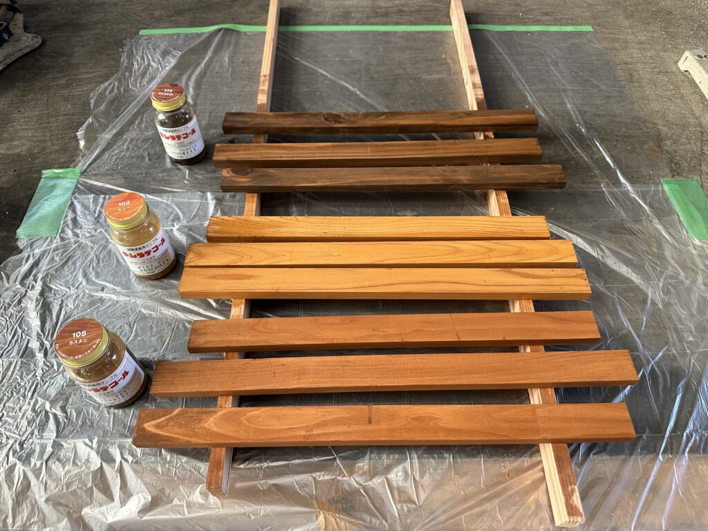 実際にフェンスで使用する木材(今回は杉)に塗装。※塗る用のサンプル木材は、木材屋なのでいっぱいあります!