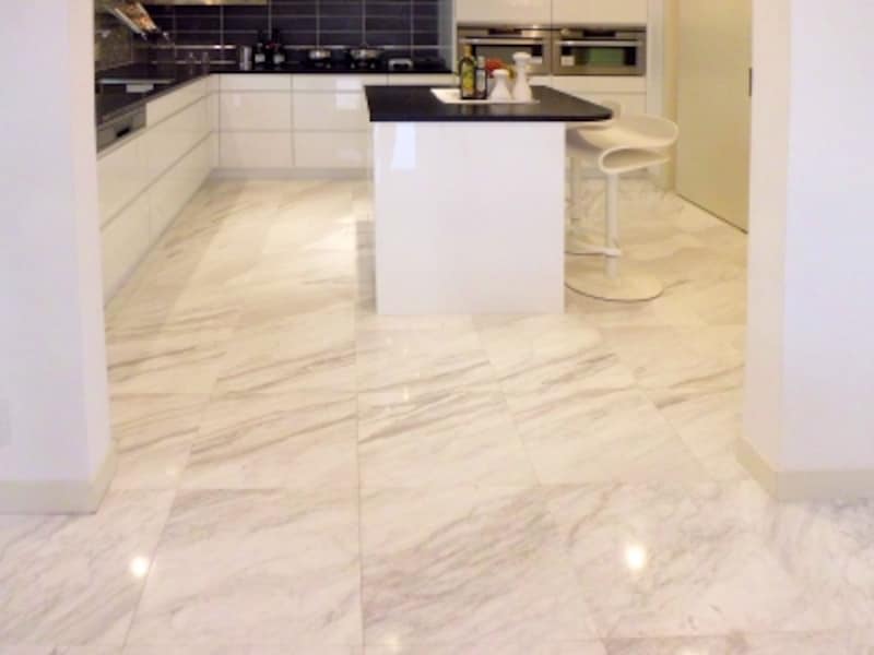 下の写真は、石等タイルだったりを床に貼った例です。見た目をとるか、様々な建材や素材には良いところ悪いところありますので何を優先するべきかよくご検討ください。
