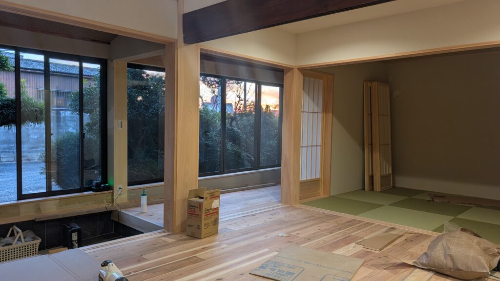 リノベーションでは、古い構造に新しい設備や建具を取り付けていきます。