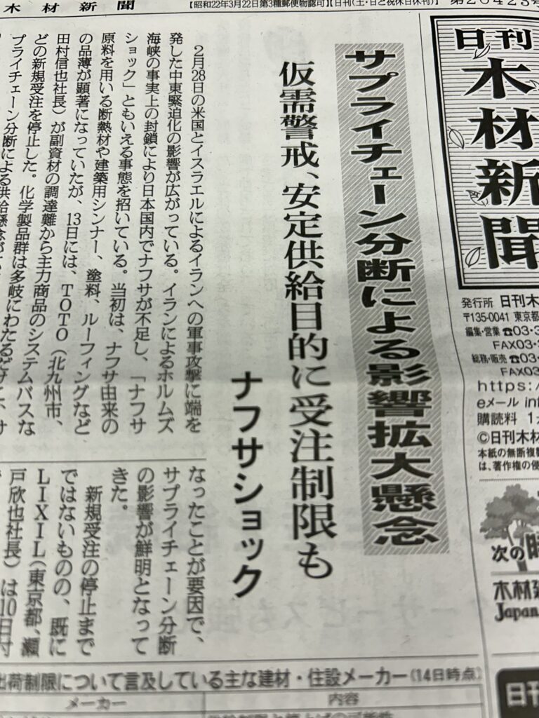 我々住宅業界では必要部材が一品でも入らないと、住宅の引き渡しが出来なくなりますが、当面の間はナフサ由来部材を使わない仕様にするのが工事を順調に進めるポイントになると考えます。自然素材を多用し、お風呂も在来工法とか選択肢はあるとは思うのですが。